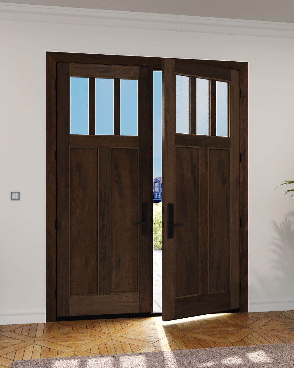 Mahogany Craftsman Vertical 3 Lite, Top View SDL 2 Panel Shaker Double Door|CRF3H-SH-FP