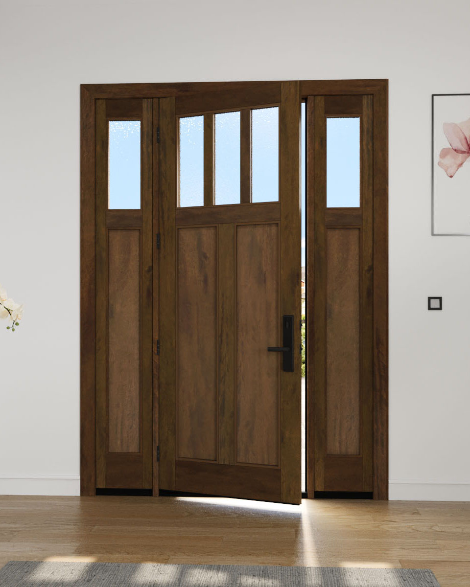 Mahogany Craftsman Vertical 3 Lite, Top View SDL 2 Panel Shaker Single Door, Sidelites|CRF3H-SH-FP