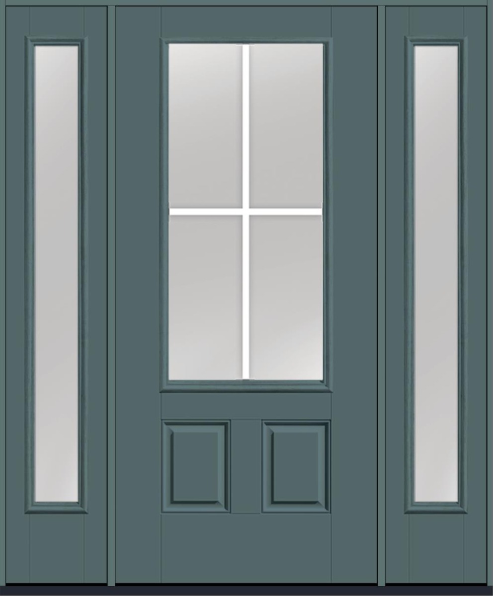 80" Clear Colonial 4 Lite Flat Bar GBG Smooth 3/4 Lite 2 Panel Fiberglass Single Door, Full Sidelites