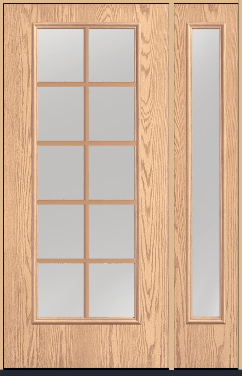 80" Low-E Colonial 10 Lite SDL Oak Full Lite Fiberglass Single Door, Full Sidelite