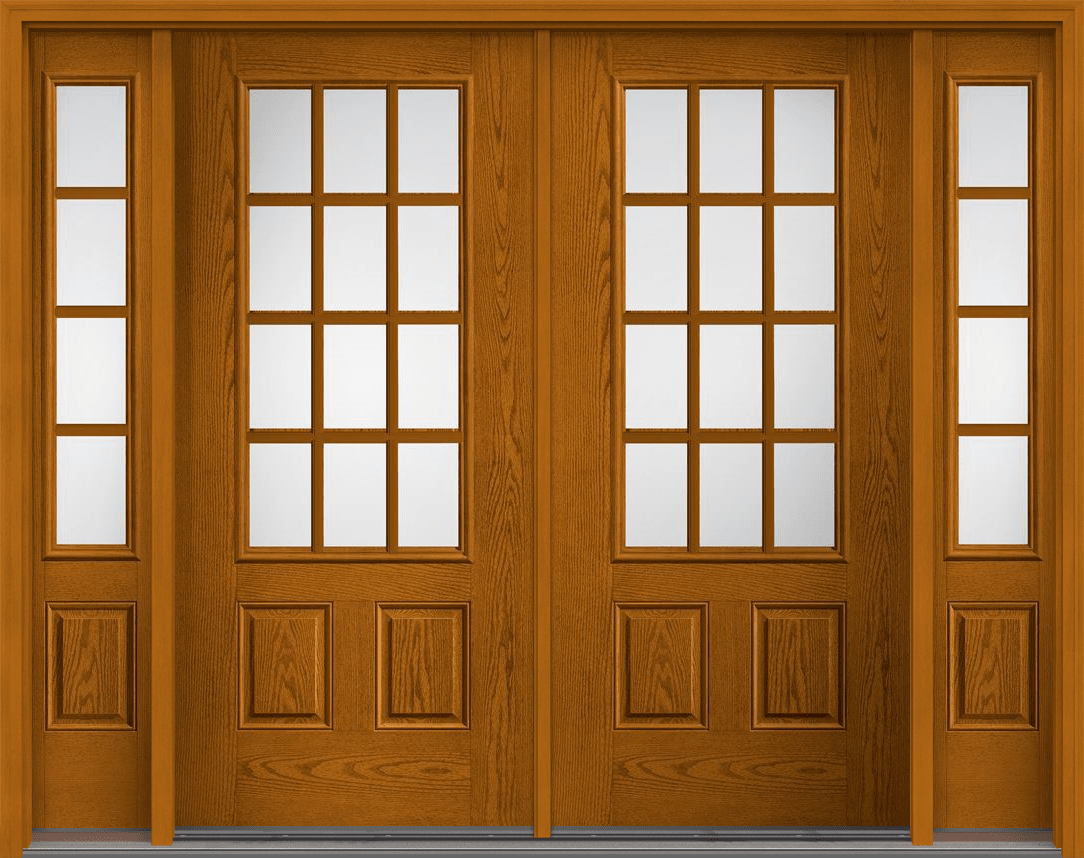80" Low-E Colonial 12 Lite SDL Oak 3/4 Lite 2 Panel Fiberglass Double Door, Sidelites
