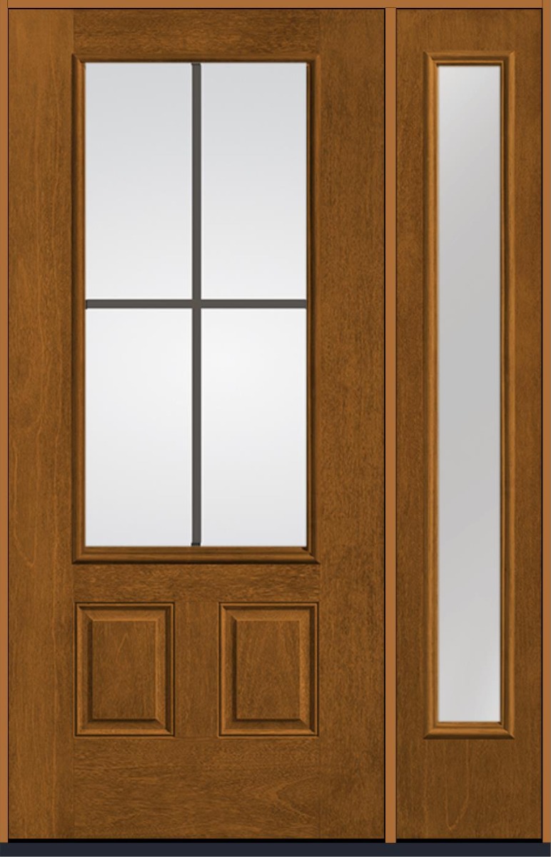 80" Low-E Colonial 4 Lite Flat Bar GBG Mahogany 3/4 Lite 2 Panel Fiberglass Single Door, Full Sidelite
