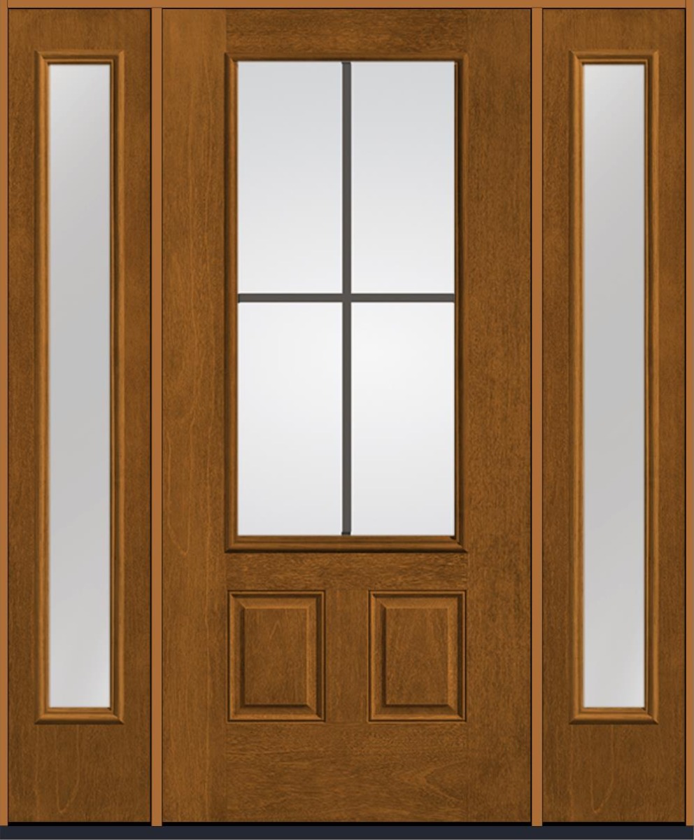 80" Low-E Colonial 4 Lite Flat Bar GBG Mahogany 3/4 Lite 2 Panel Fiberglass Single Door, Full Sidelites