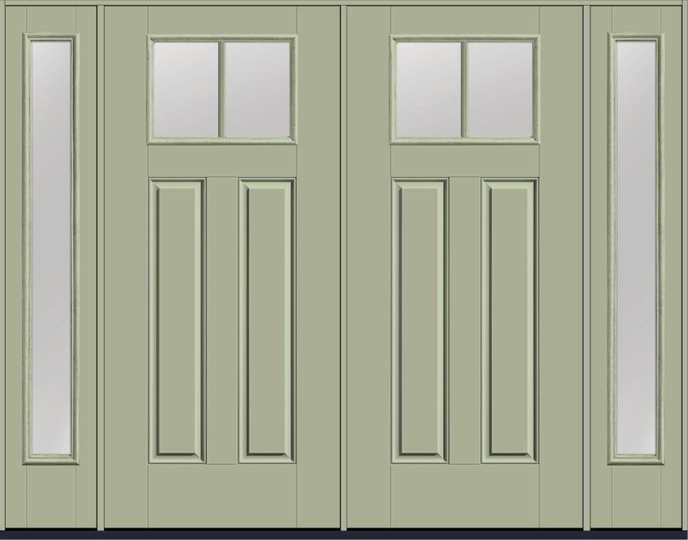 80" Low-E Craftsman Top View 2 Lite 2 Panel SDL Smooth Fiberglass Double Door, Full Sidelites