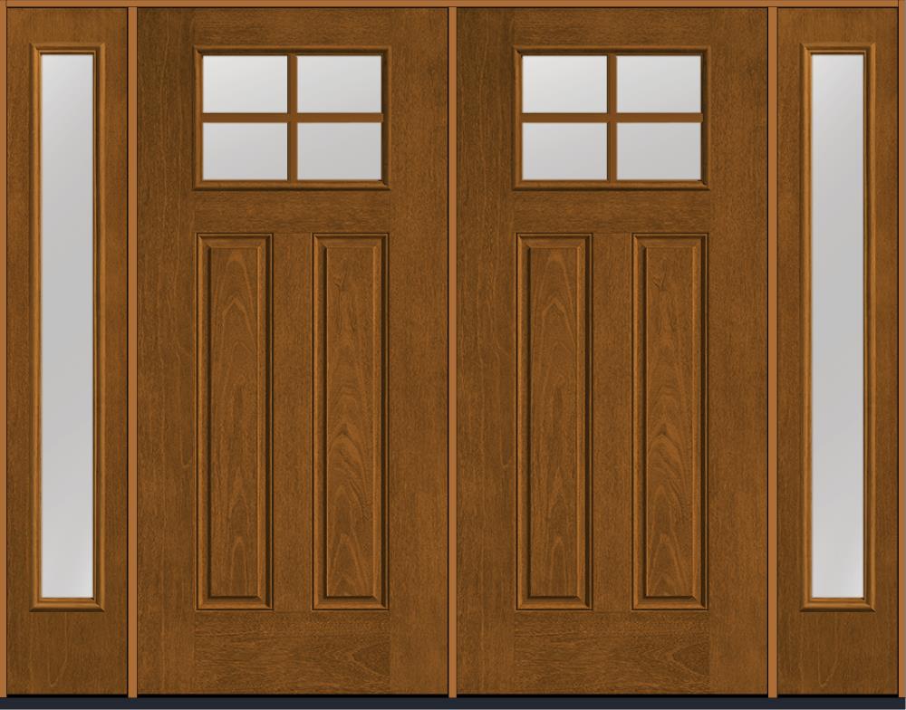80" Low-E Craftsman Top View 4 Lite 2 Panel SDL Mahogany Fiberglass Double Door, Full Sidelites