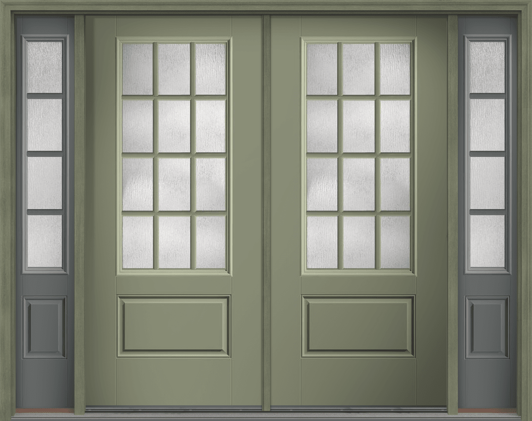 80" Rainglass Colonial 12 Lite SDL Smooth 3/4 Lite 1 Panel Fiberglass Double Door, Sidelites