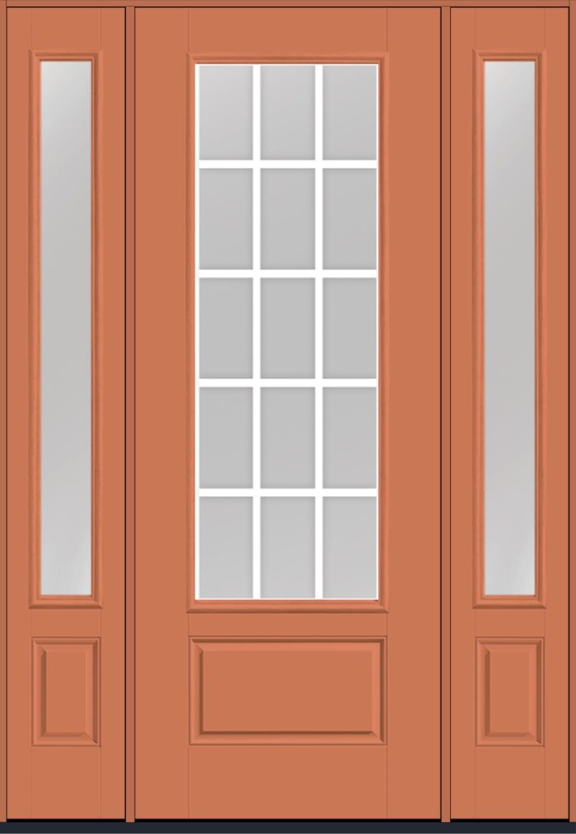96" Low-E Colonial 15 Lite Flat Bar GBG Smooth 3/4 Lite 1 Panel Fiberglass Single Door, Sidelites