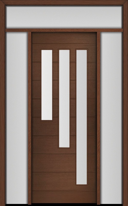 96" Mahogany Flores Diagonal 3 Lite V2 Contemporary Modern Single Door/2Sidelite & Rec Transom