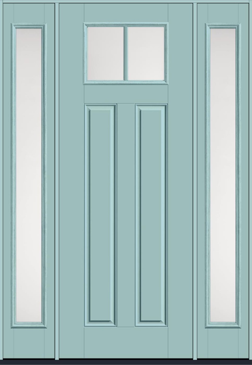 96" Satin Etch Craftsman Top View 2 Lite 2 Panel SDL Smooth Fiberglass Single Door, Full Sidelites