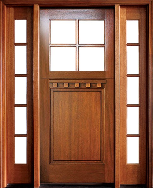 80" Craftsman Mahogany 1 Panel 4 Lite TDL Square Single Door/2Sidelite