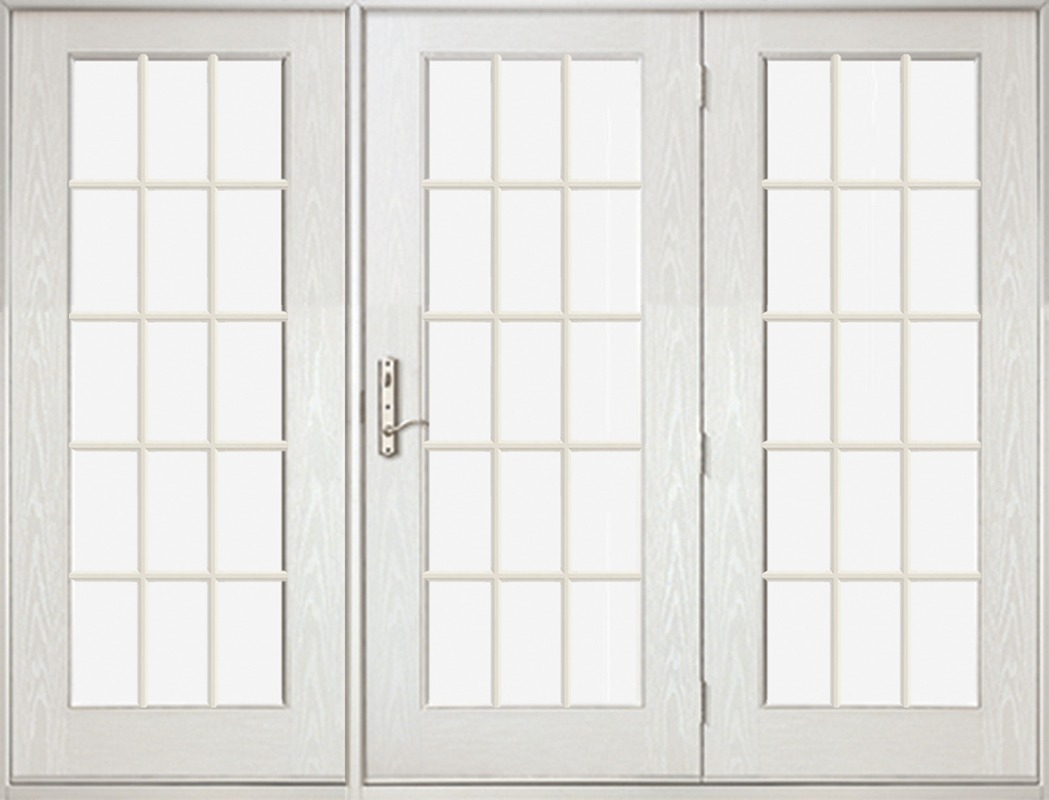 Low-e Full Lite, 15 Lite SDL Fiberglass Center Hinged Triple Door