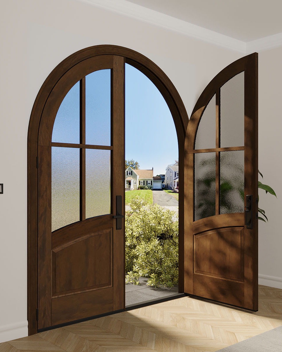 Mahogany Round Top 2/3 Lite, 4 Lite SDL 1 Panel Shaker Double Door|G23014-R-RTP-SH