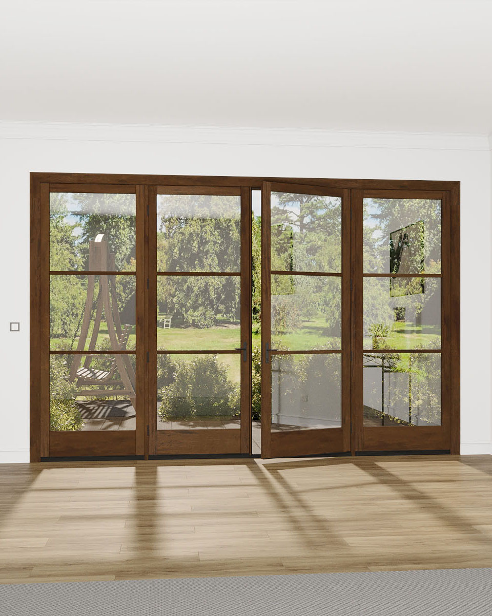Mahogany Full Lite, Horizontal 3 Lite SDL Contemporary Modern Narrow Profile Shaker Quadruple Door