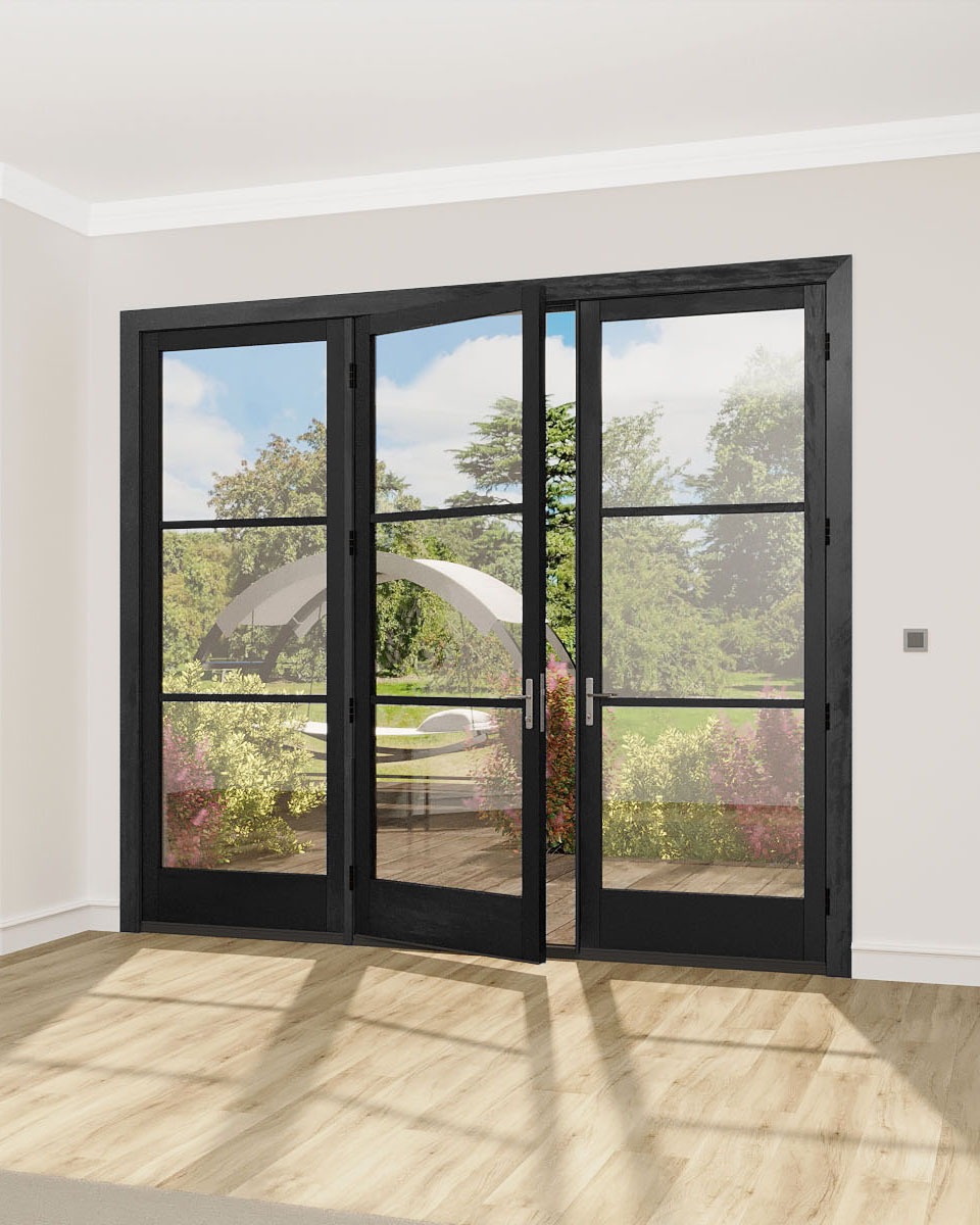 Mahogany Full Lite, Horizontal 3 Lite SDL Contemporary Modern Narrow Profile Shaker Triple Door