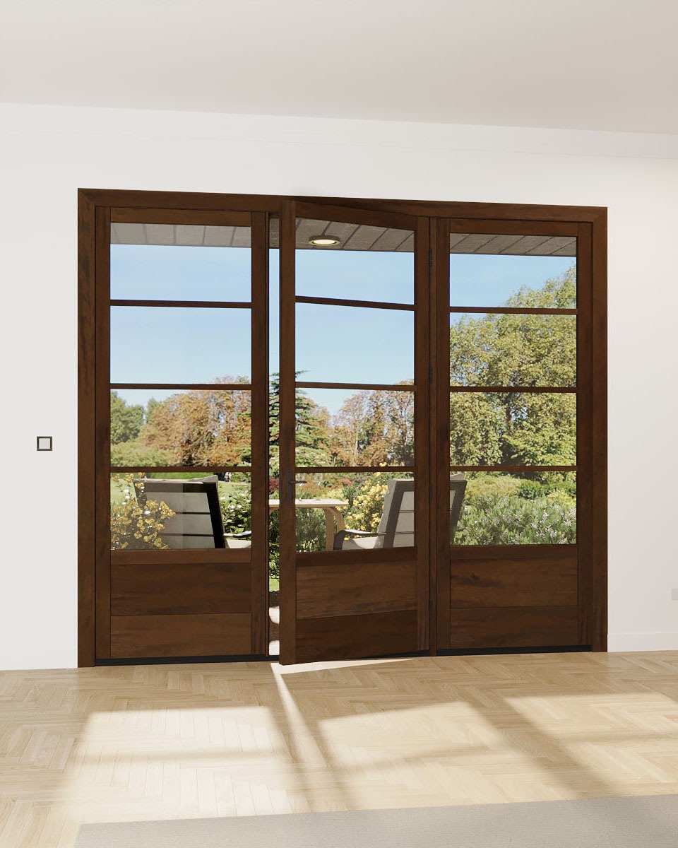 Mahogany 3/4 Lite, Horizontal 4 Lite SDL Contemporary Modern 1 Panel Narrow Profile Shaker Triple Door