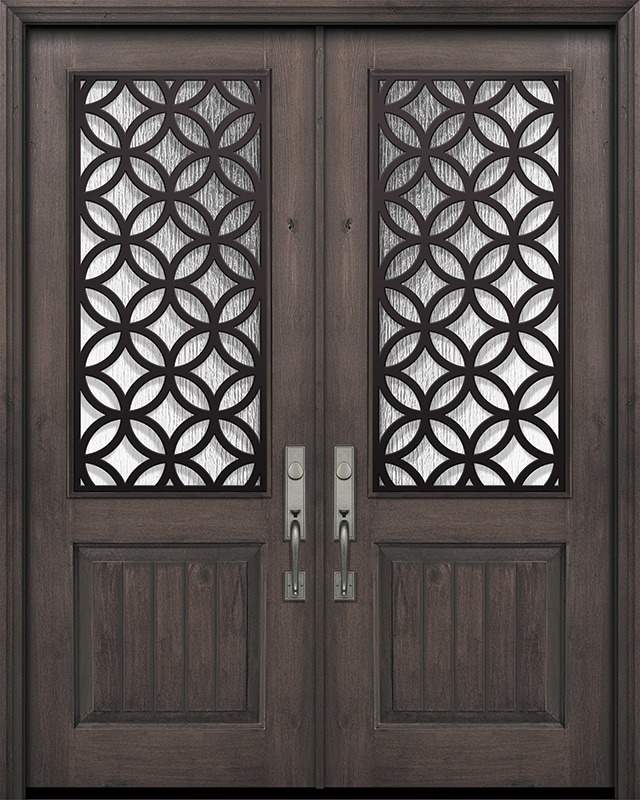 IMPACT | 96" Prefinished Distressed Knotty Alder Double 1 Panel 2/3 Lite Eclectic Steel Grille Door