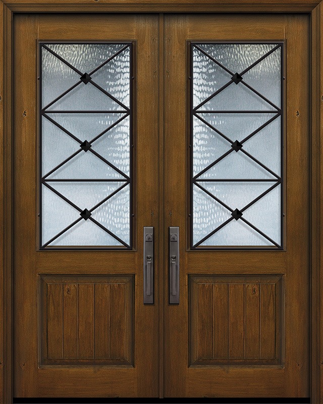 IMPACT | 96" Prefinished Distressed Knotty Alder Double 1 Panel 2/3 Lite Republic Wrought Iron Door