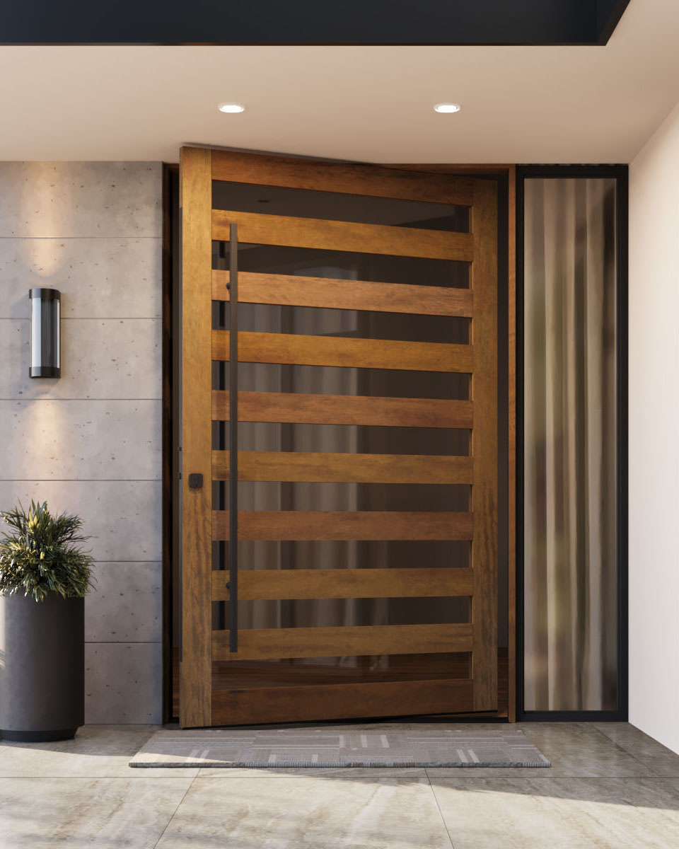 The "LineaLux" door features sleek horizontal lines that create a modern, minimalist aesthetic. Made of premium Mahogany Hardwood, this custom-made door balances elegance and contemporary style, allowing natural light to filter through its staggered, frosted glass panels.