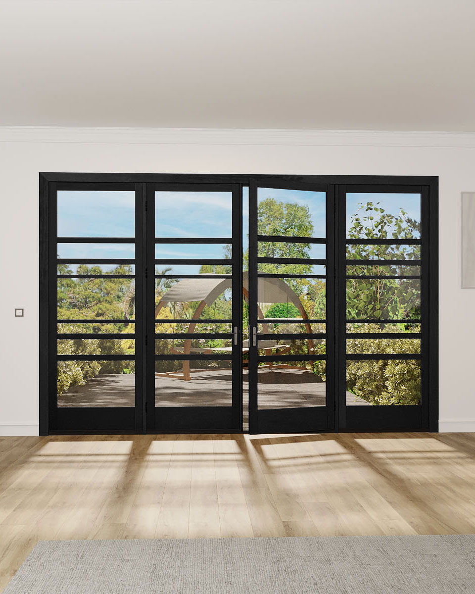 Mahogany Horizon Full Lite Artistic Lite SDL Contemporary Modern Narrow Profile Shaker Quadruple Door