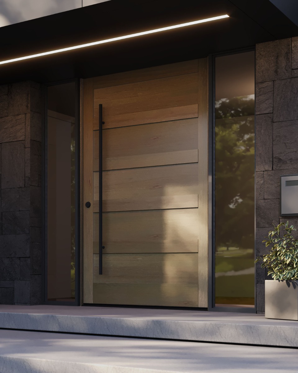 The Pentara  door exemplifies modern elegance with its five sleek wooden panels and innovative pivot mechanism. This design not only makes a bold statement but also offers smooth, effortless functionality.
