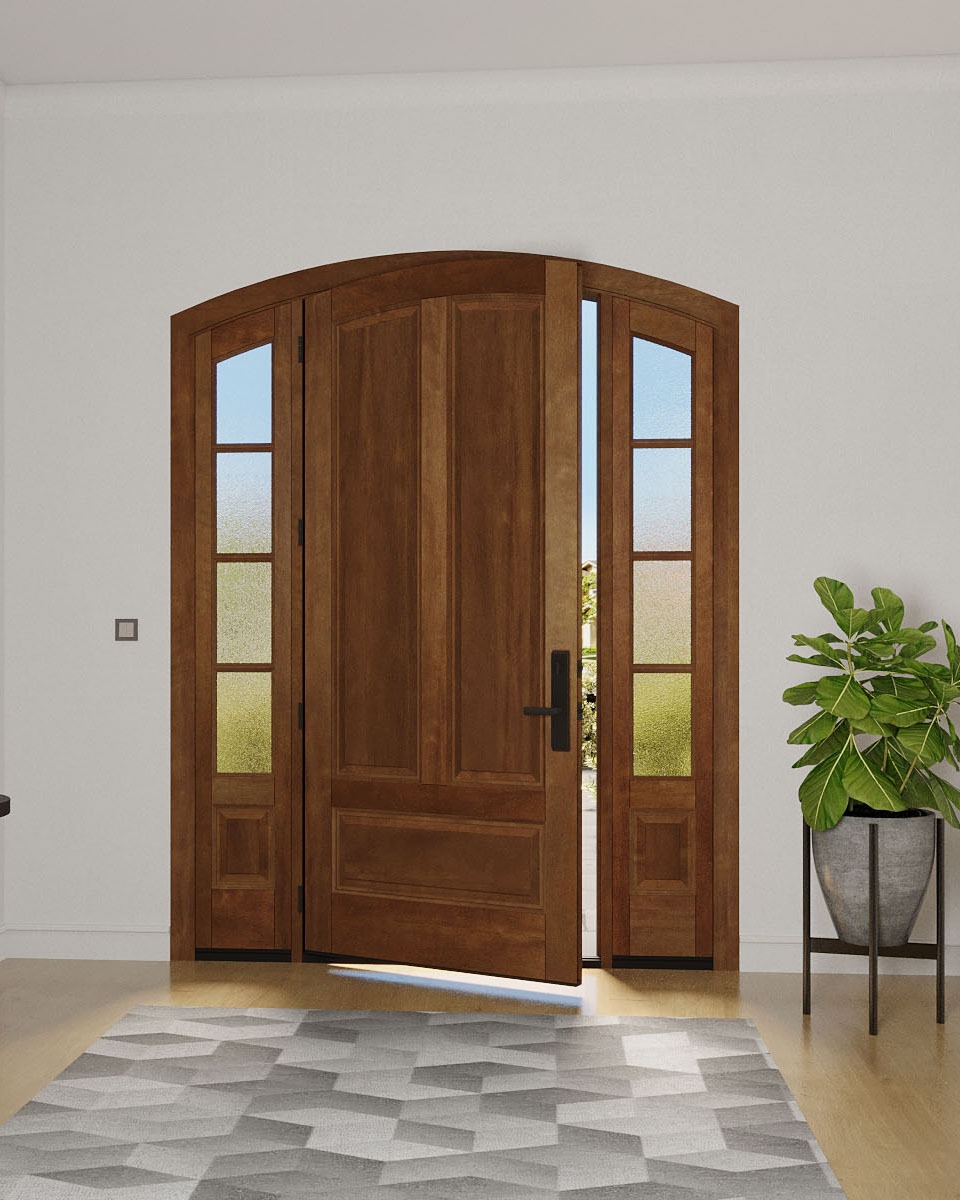 Mahogany Montana Arch Top Colonial 3 Panel Solid Single Door, Sidelites|P75201-ART-OG_G75401-ARTP-SL_1-2